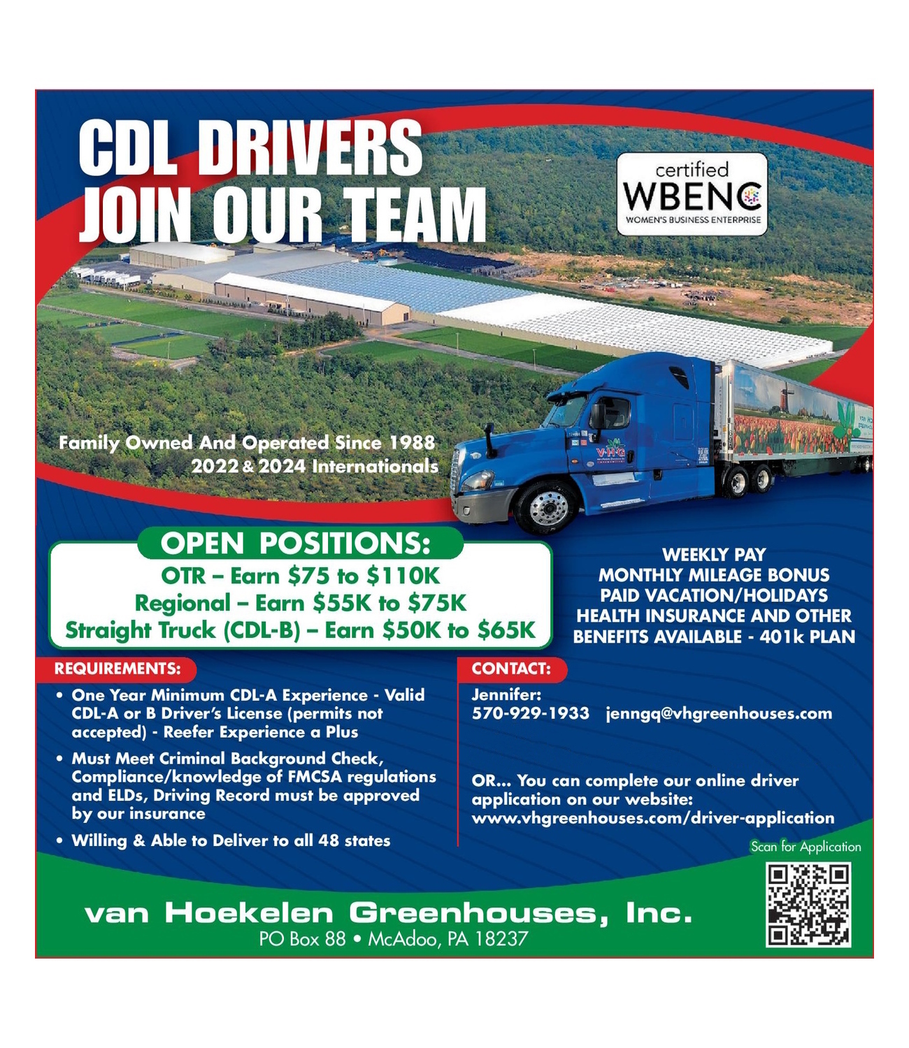 Join our team! Drivers are paid by the hour with monthly safety bonuses. Trips are over-the-road and multi-day anywhere in the continental US. We have excellent compensations and benefits. Trucks are newer 2022 & 2024 Internationals with automatic transmissions.